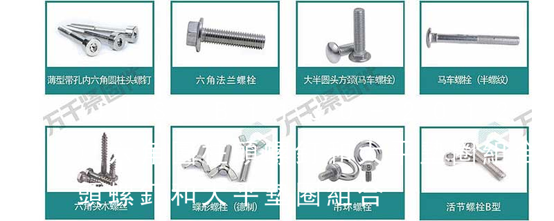 1.機螺釘 2.自攻螺釘 3.鉆尾螺釘 4.墻板釘 5.纖維板釘 6.木螺釘7.六角木螺釘 8.不脫出螺釘 9.組合螺釘 10.微型螺釘 11.家具螺釘 12.電子螺釘頭型:1.六角頭(hexagon head) 2.六角頭法蘭面(hexagon head with flange) 3.